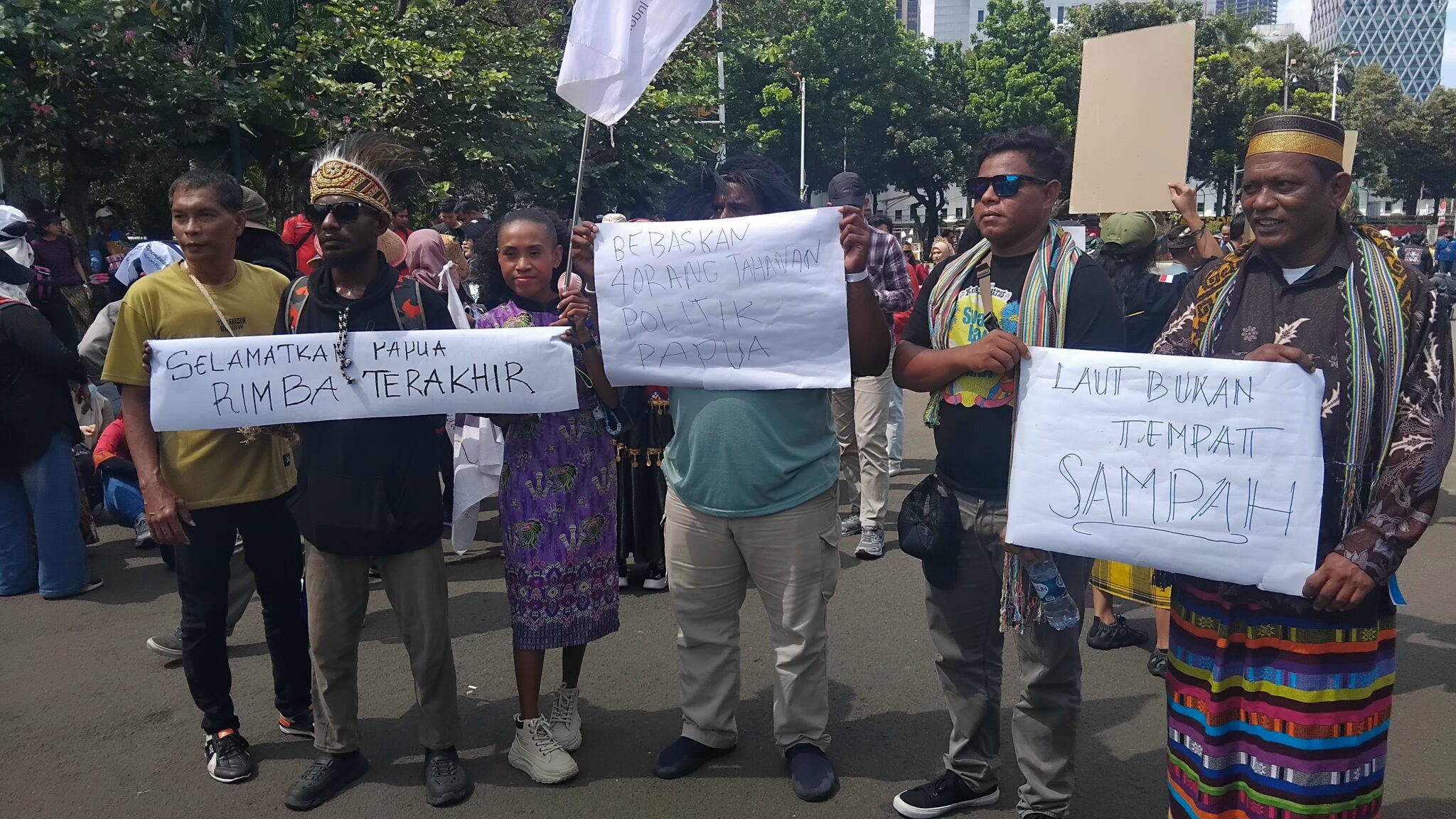 “Di Papua dampak kerusakan iklim sangat terasa, apalagi banyak kebijakan pusat yang keluar tanpa meminta persetujuan kami sebagai pemilik wilayah,” ujar Aris saat ditemui di sela-sela aksi.