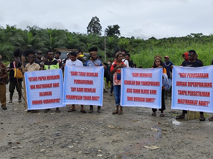 Aksi yang dipimpin Koordinator Lapangan Absalom Urumban itu diikuti ratusan warga adat dengan membentangkan baliho tuntutan di depan kantor perusahaan.